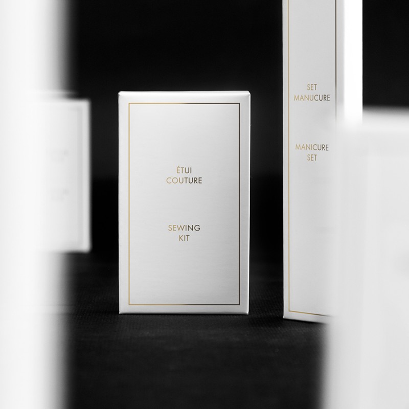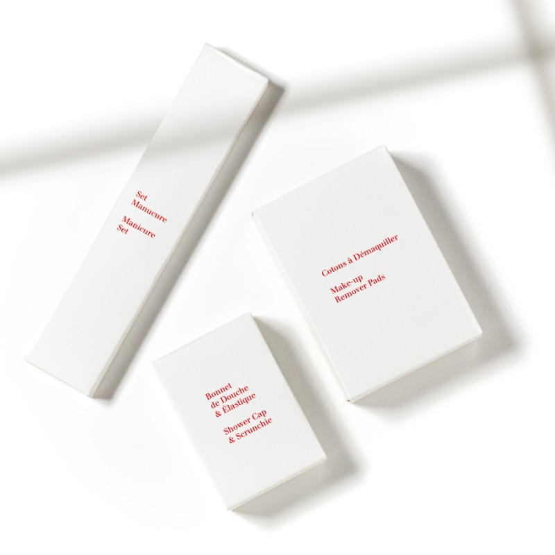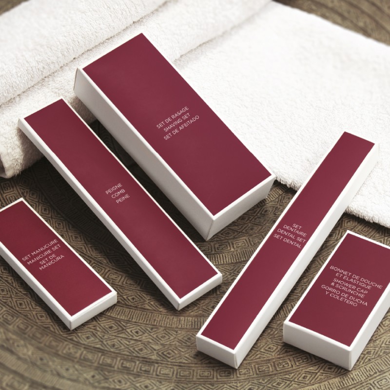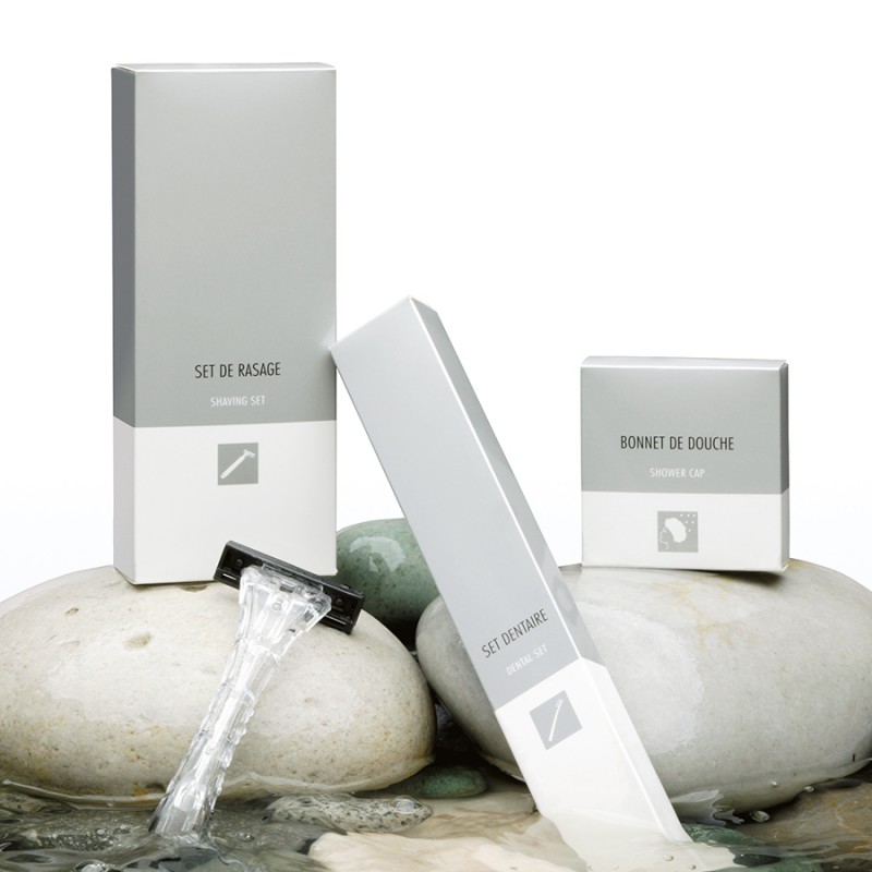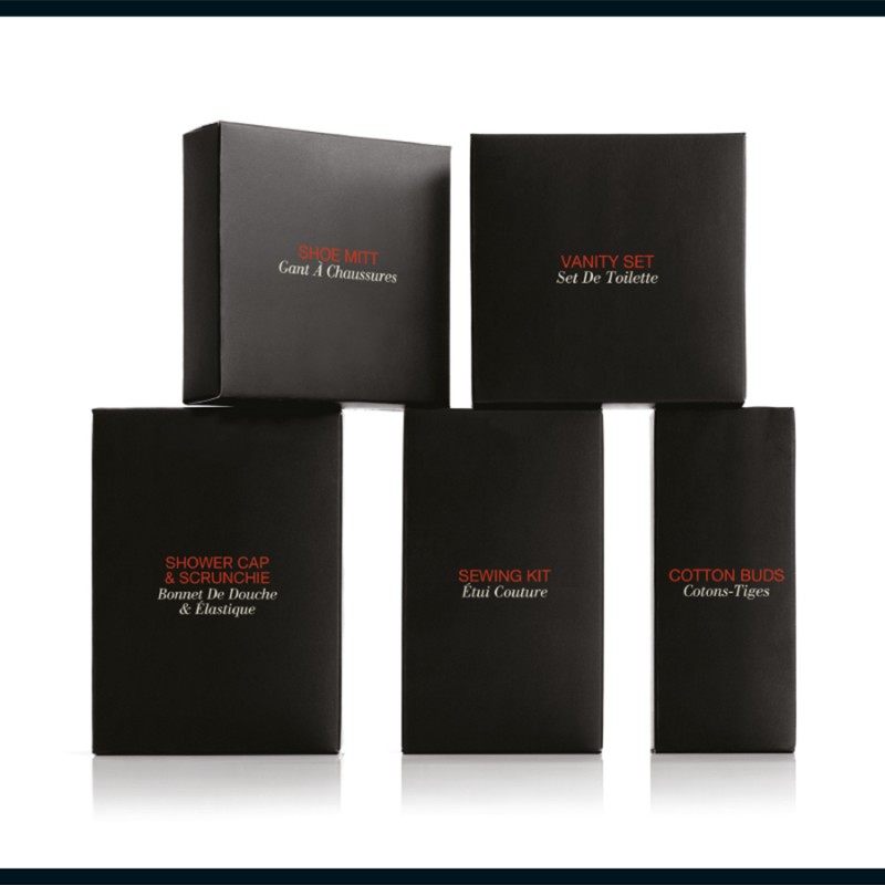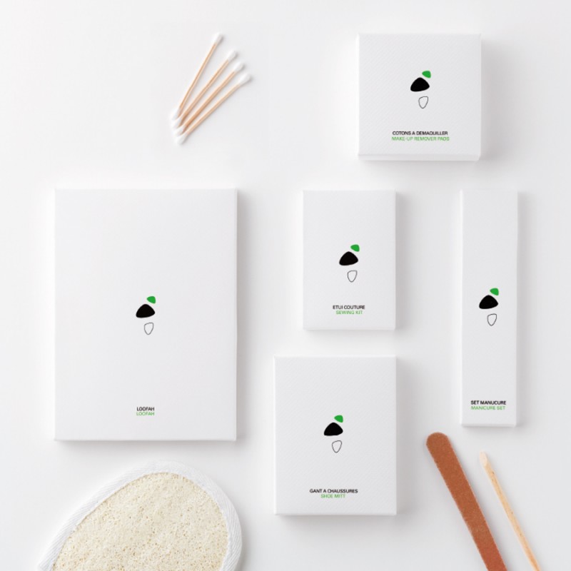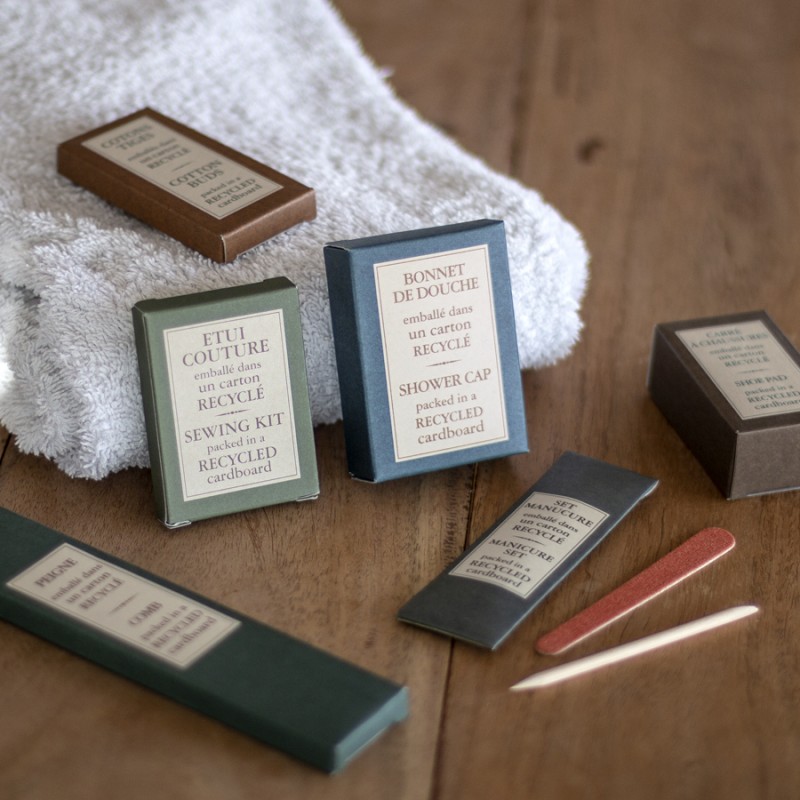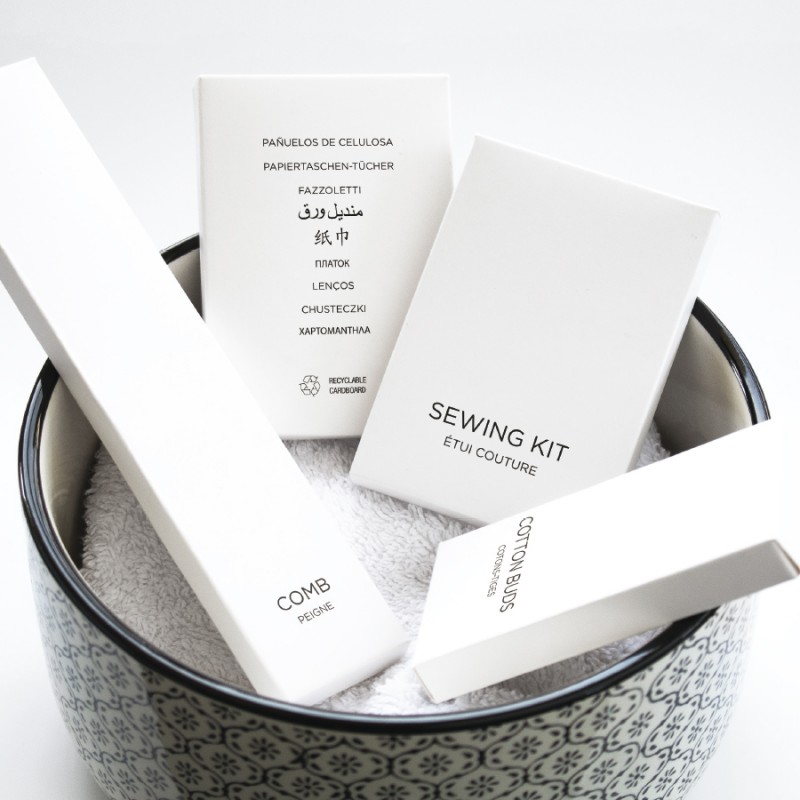 Vegetable bath sponge - Slippers - Comb - Toothbrush - Dental set - Tissues - Nail file - Manicure set - Cotton swabs - Makeup remover pads - Shoe mitt - Sewing kit